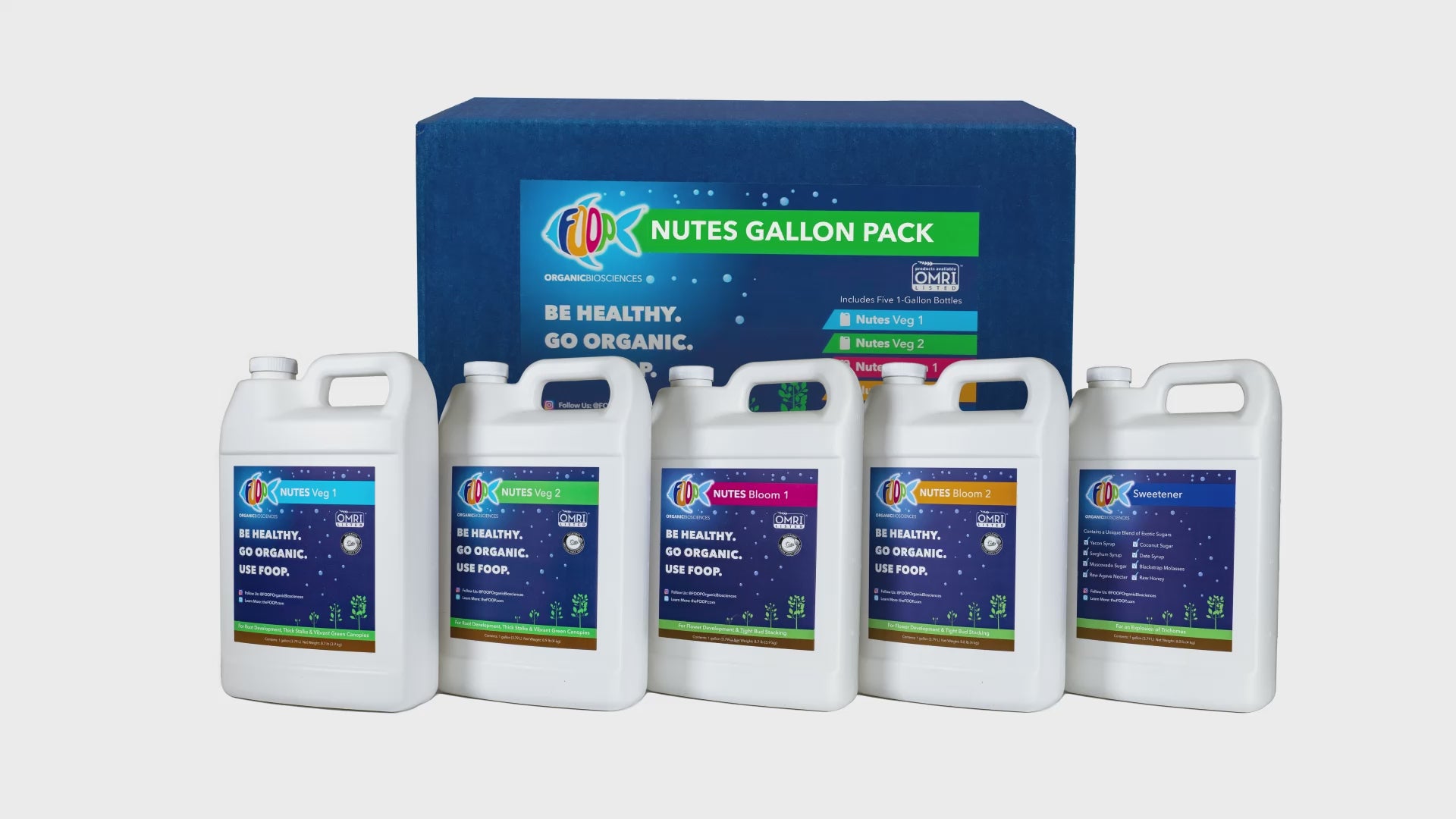 This item is a bundle of a FOOP Veg Gallon Pack and a FOOP Bloom Gallon Pack. Contains a total of six (6) one-gallon bottles; 1x each of FOOP Nutes Veg 1, Veg 2, Bloom 1, Bloom 2, and 2x FOOP Sweetener.