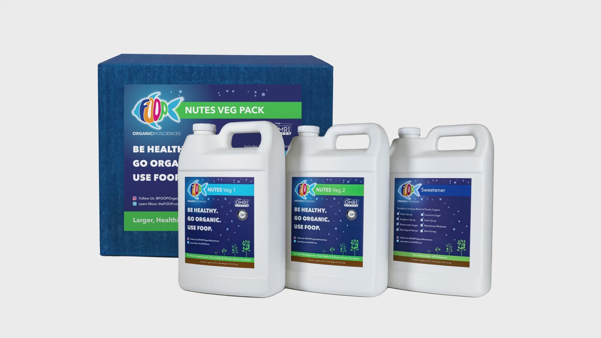 Contains one 1-gallon jug each of FOOP Nutes Veg 1, FOOP Nutes Veg 2, and FOOP Sweetener.